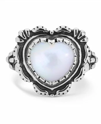 Earthy, yet elegant, this sterling silver white mother of pearl ring from American West Jewelry is sure to please. The center cabochon is distinctively heart shaped with a serrated bezel-style setting.
