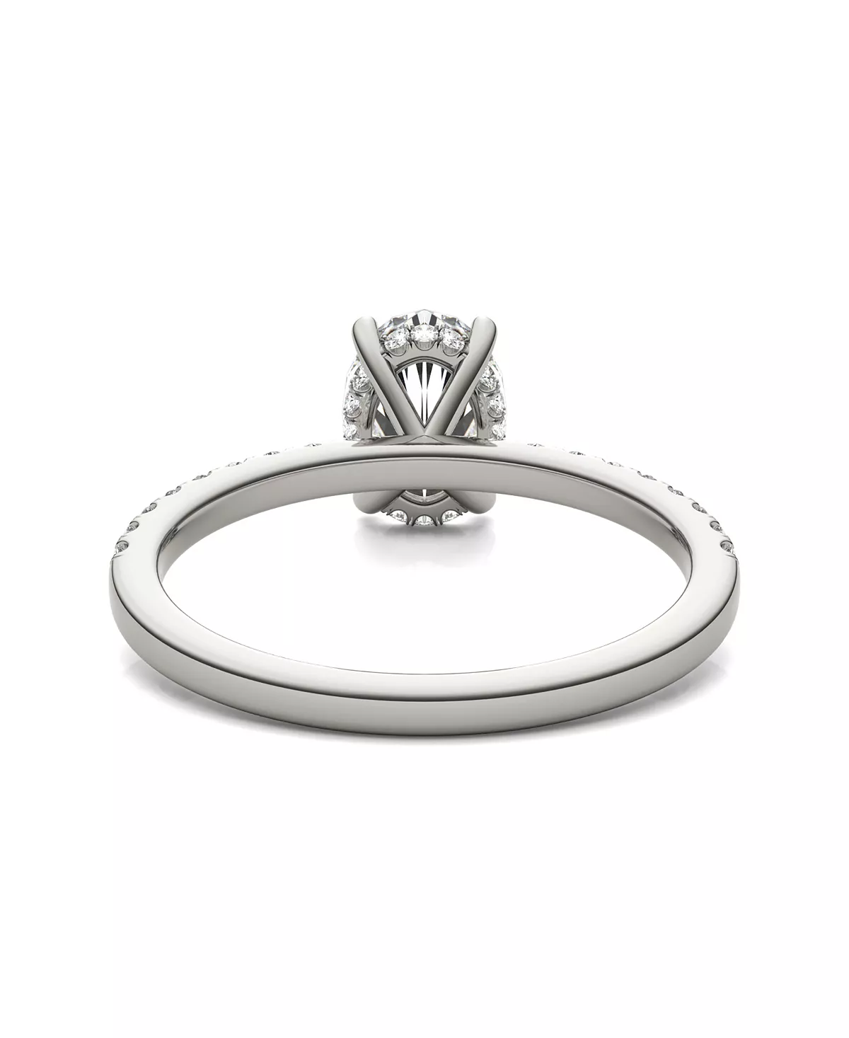 A bold, yet timeless style, perfect for any bride. An elegantly crafted band adorned with a hidden halo of delicate round-cut moissanite gemstones beneath a stunning oval centerpiece. This handcrafted engagement ring exudes luxury, sophistication and glamour.