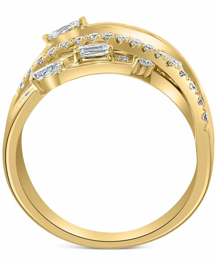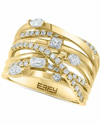 Dual ribbons of round-cut diamonds cross over polished gold rows of this EFFY® ring, randomly set with marquise-, square-, emerald-, and pear-cut diamonds.