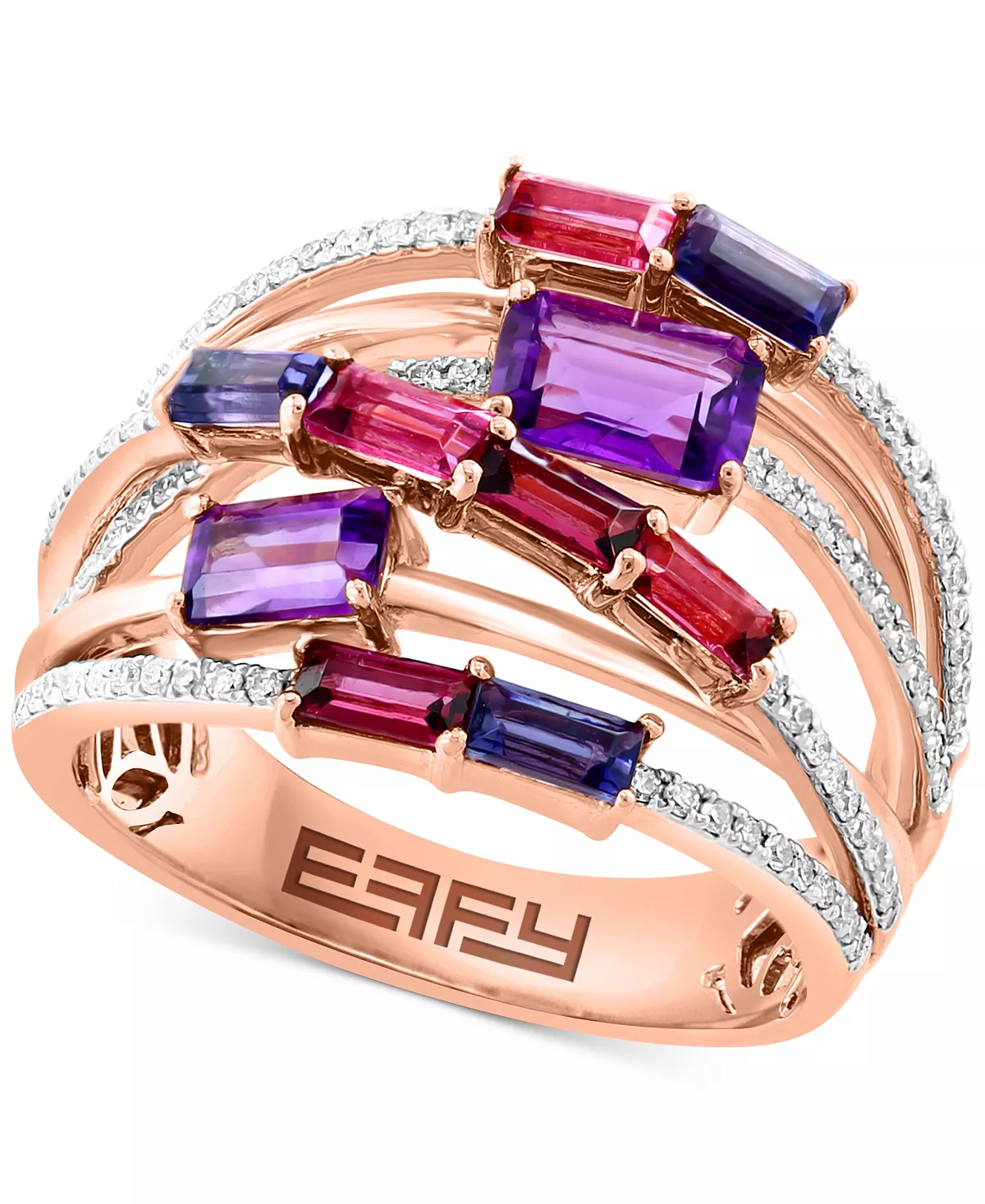 Colorful amethyst, rhodolite, iolite, and pink tourmaline baguettes adorn a multi-row rose gold ring adorned with sparkling diamonds – from EFFY®.