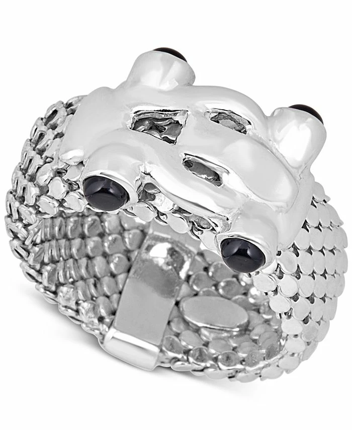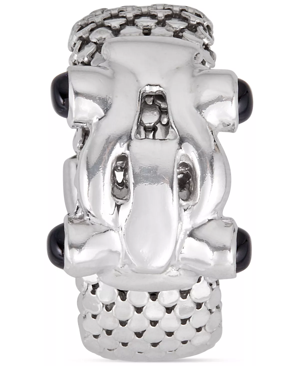 Shimmering round-shape black onyx adds contrast to this chic horseshoe statement ring with scale weave design.