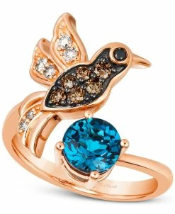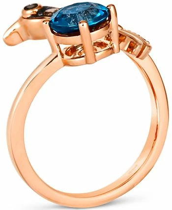 A Chocolate Diamond® hummingbird with Nude Diamond™ wings and a Blackberry Diamond™ eye is perched on a vibrant Deep Sea Blue Topaz™ on this whimsical rose gold ring from Le Vian.