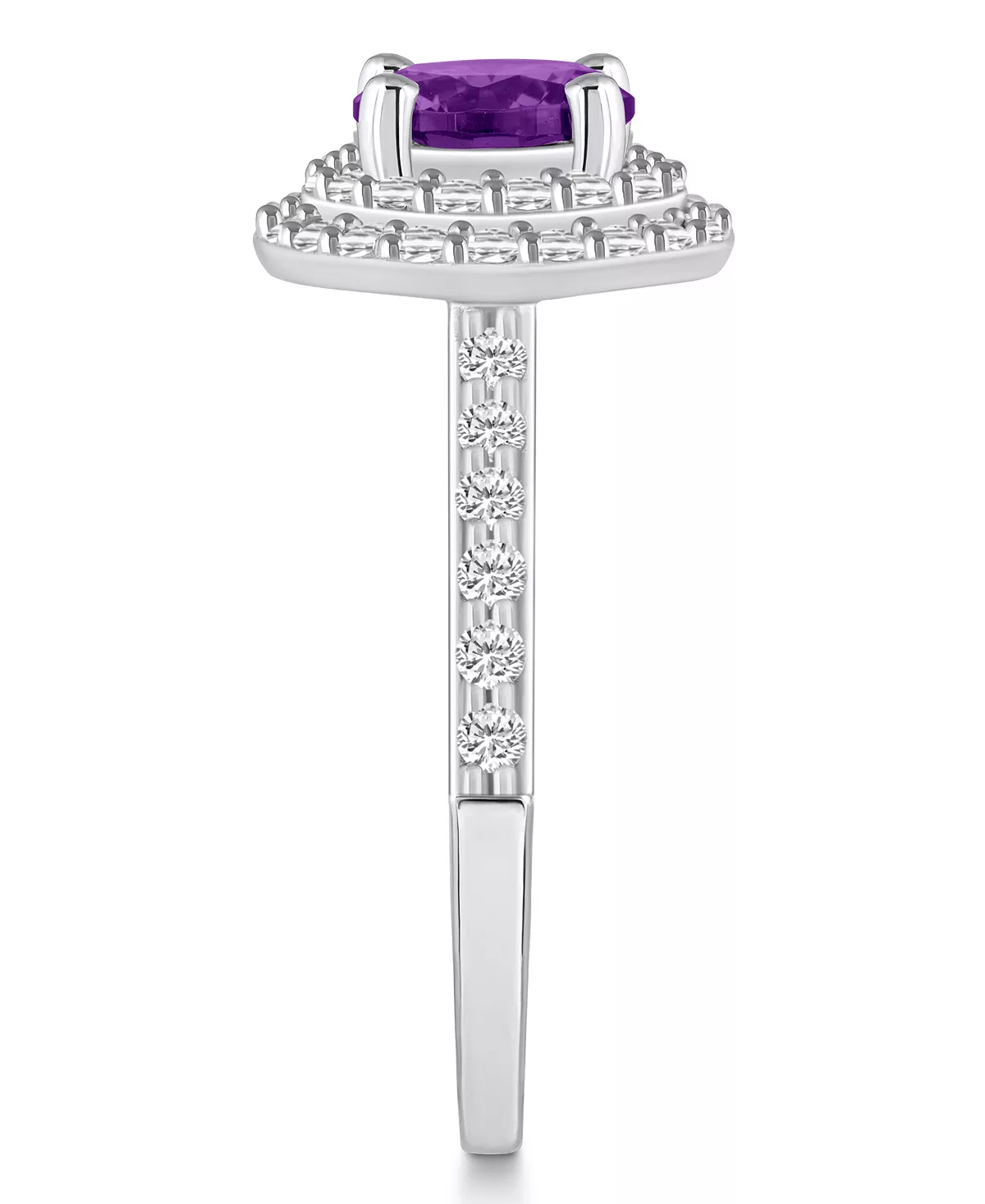 A delectable 7mm round amethyst is haloed by brilliant round diamond accent in this enticing statement ring.