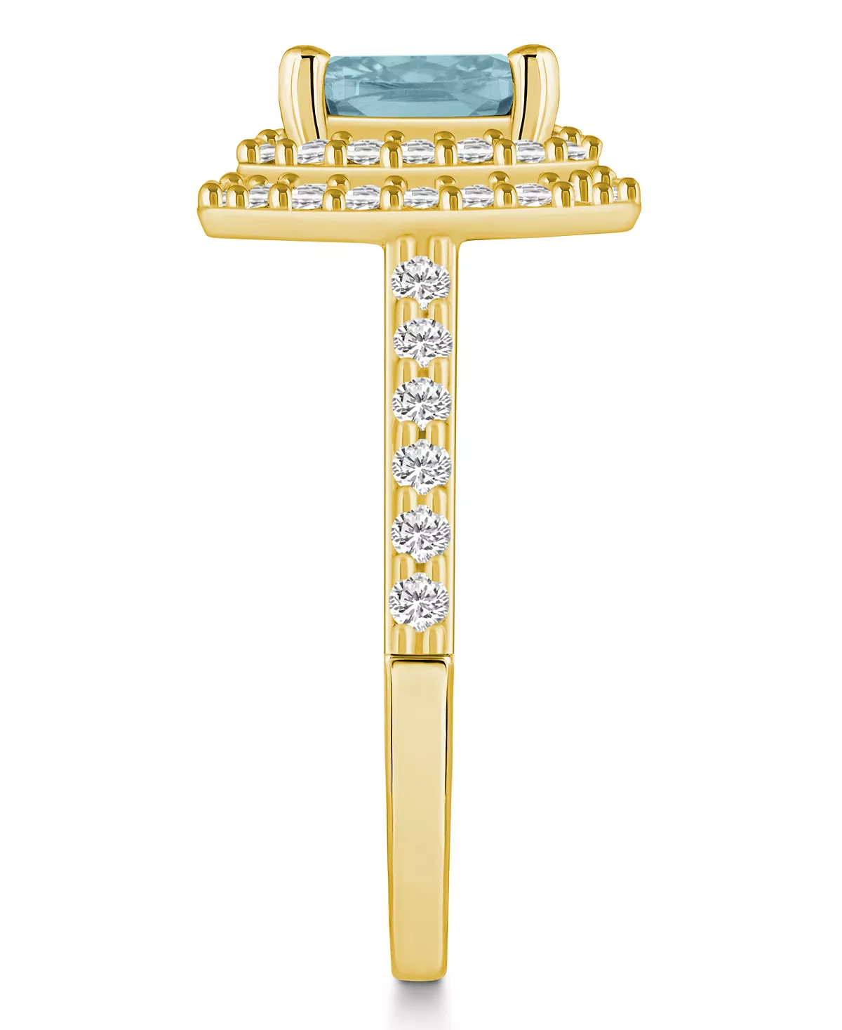 This enticingly elegant ring features a dazzling 8mm cushion aquamarine, embraced by a halo of brilliant round diamond accent.