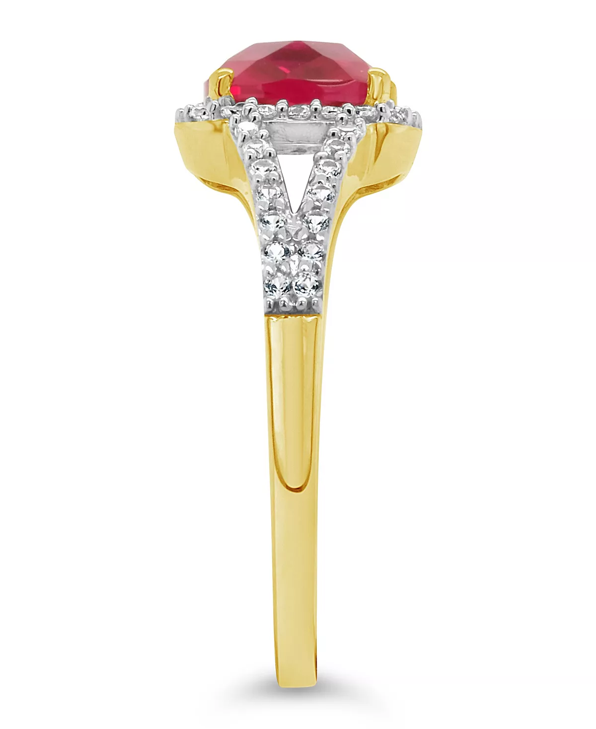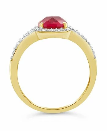 Dazzling with a created ruby center stone surrounded by illuminating created white sapphire stones, this 10k yellow gold cushion-cut halo ring is an accessory to be cherished.
