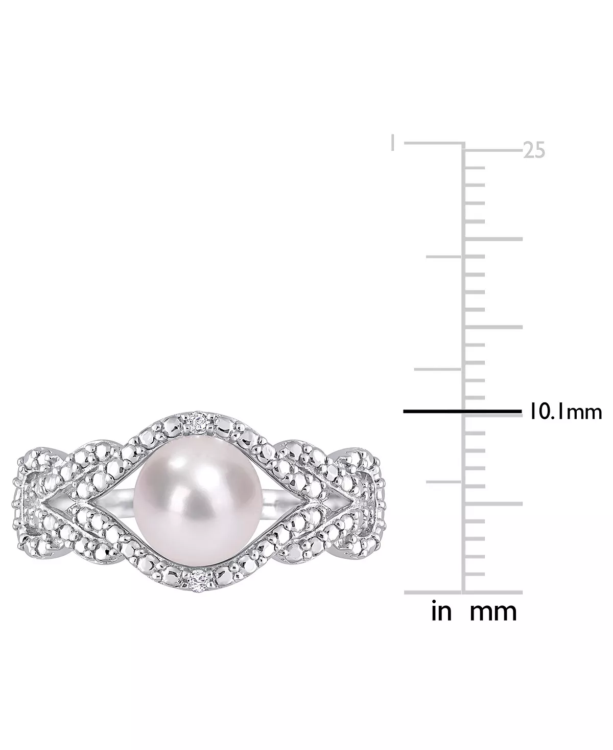 A unique openwork ring is set with a cultured freshwater pearl and a small diamond accent.