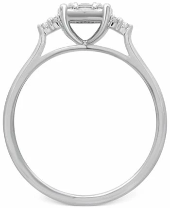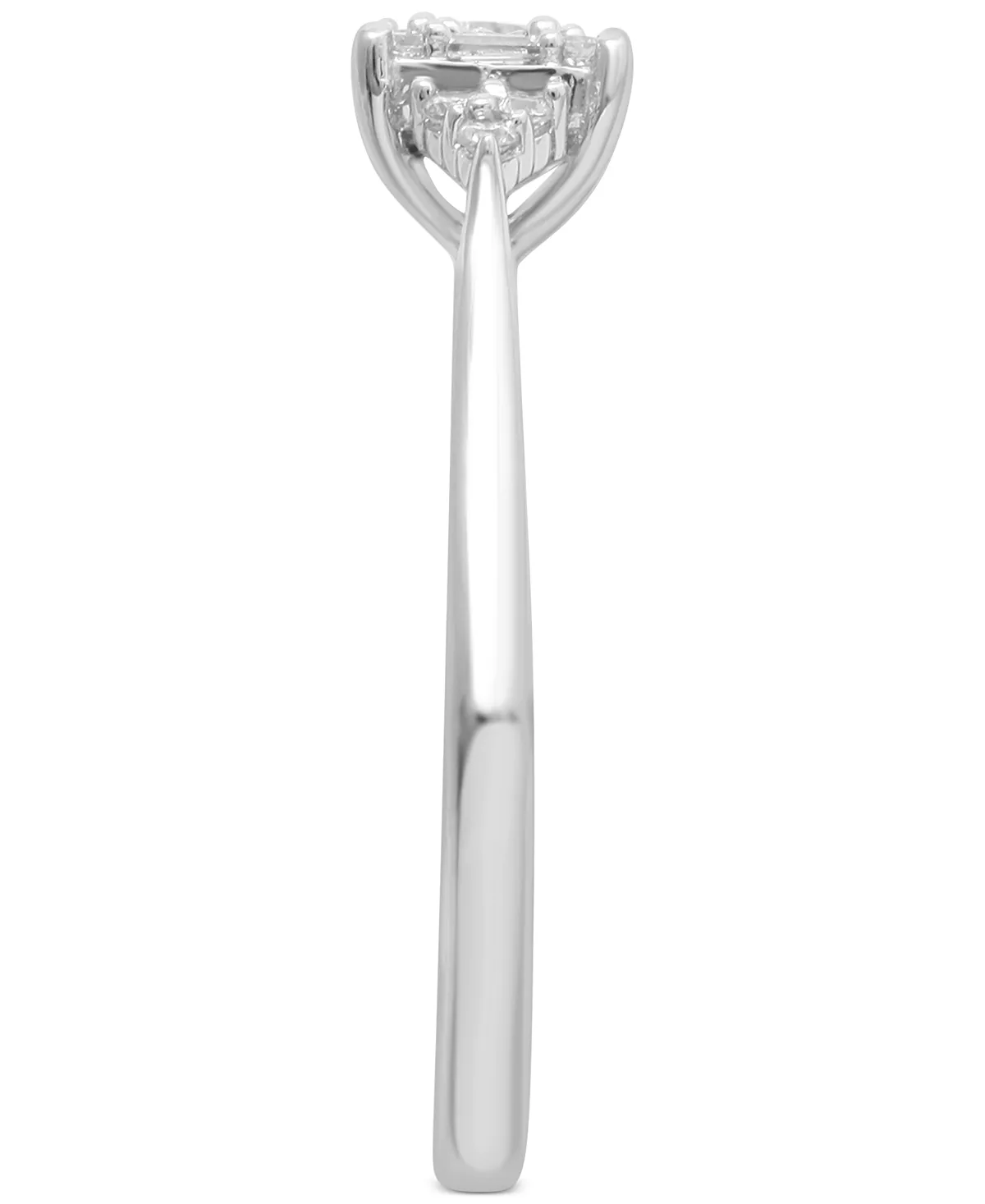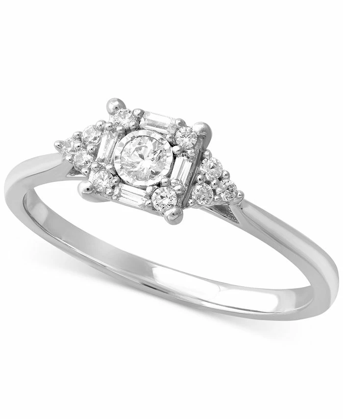 A bezel-set center stone is wrapped in a halo of round and baguette diamonds to create this chic and modern engagement or promise ring.