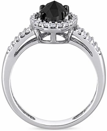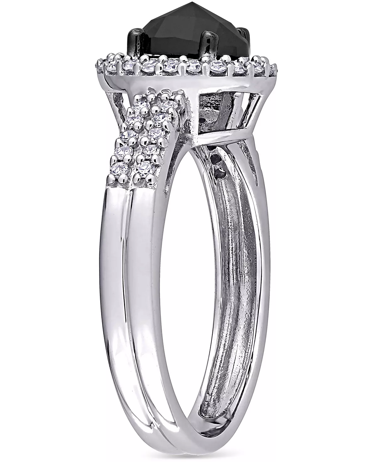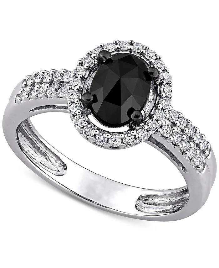 A darkly beautiful oval-cut diamond contrasts brilliantly with white diamond accents in this stunning white gold halo engagement ring.