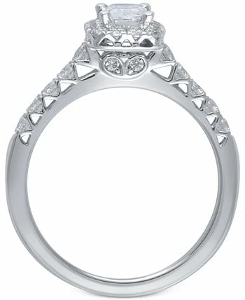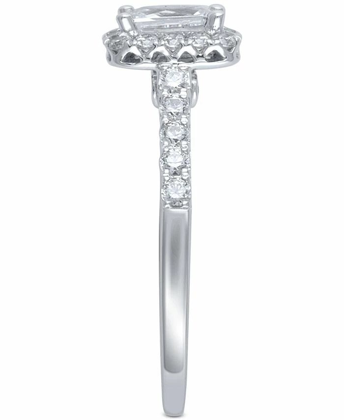 A exceptionally beautiful emerald-shape center diamond (5/8 ct. t.w.) is given well-deserved prominence in a halo of round-shape radiance in this exclusive white gold engagement ring.