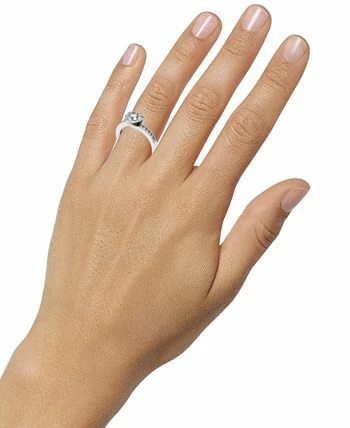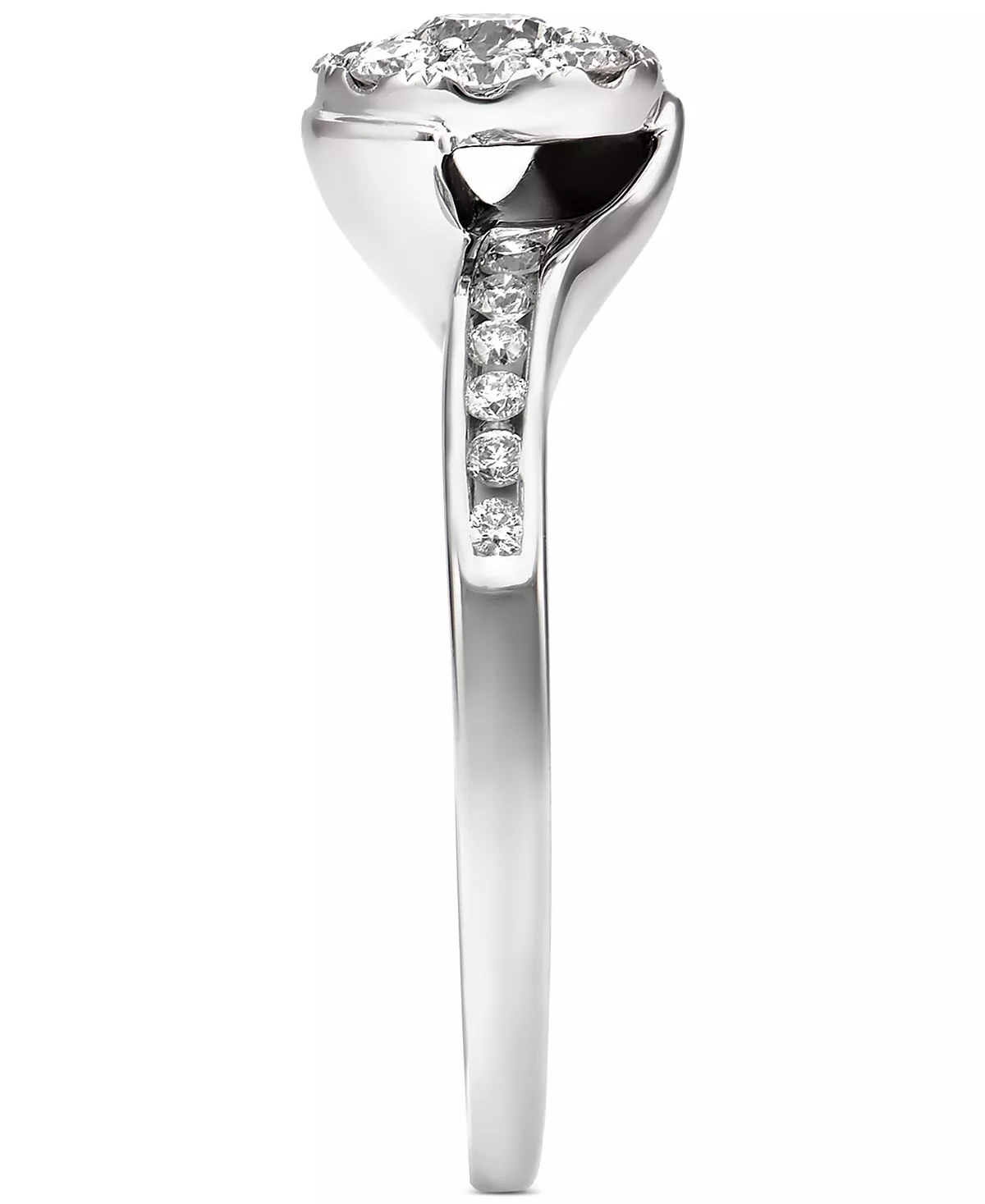 Exquisitely elegance with a sparkling halo and a pretty swirl design, this diamond ring is the epitome of romance.