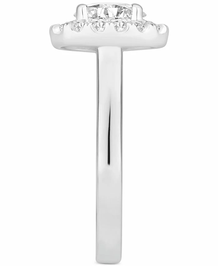 A stunning oval-cut diamond is the centerpiece of this brilliant halo design engagement ring.