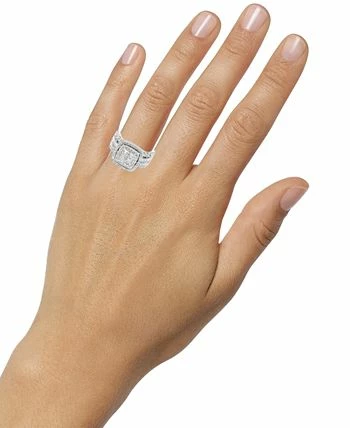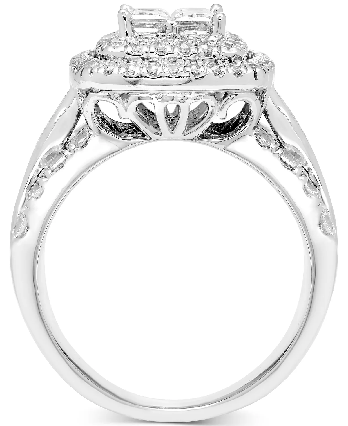 This exceptionally elegant ring features a princess-cut quad cluster center, with round and baguette accent diamonds in a 14k white gold setting.