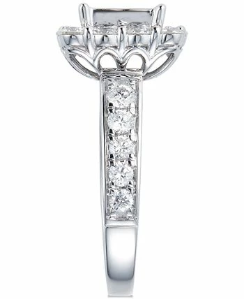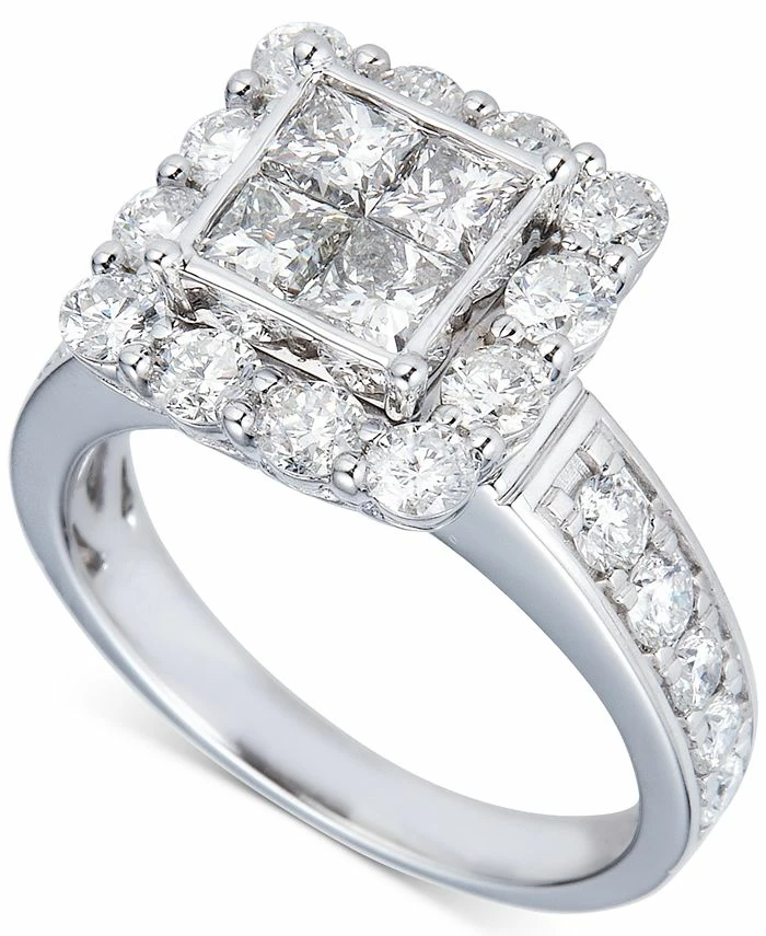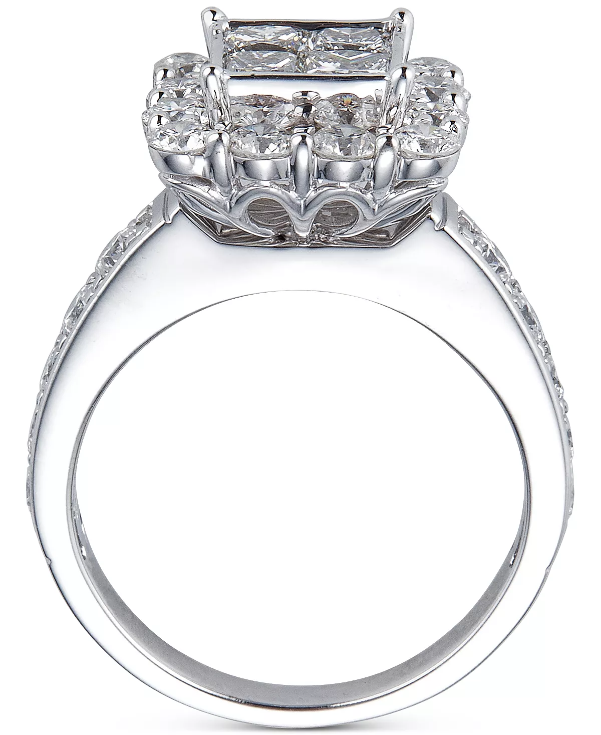 An exquisite arrangement of gorgeous princess- and round-cut diamonds adorn this dramatic quad cluster halo engagement ring.