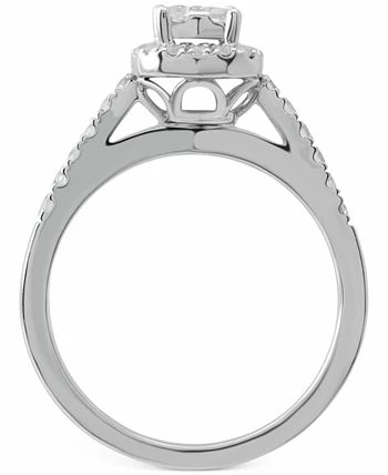 A two-level gallery setting, provides extra light-play to showcase the beauty and shine of this halo cluster engagement ring.