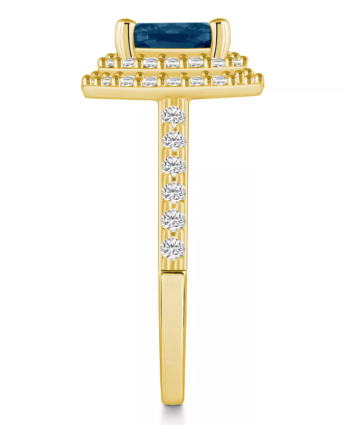 This enticingly elegant ring features a dazzling 8mm cushion London blue topaz, embraced by a halo of brilliant round diamond accent.