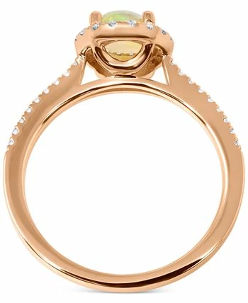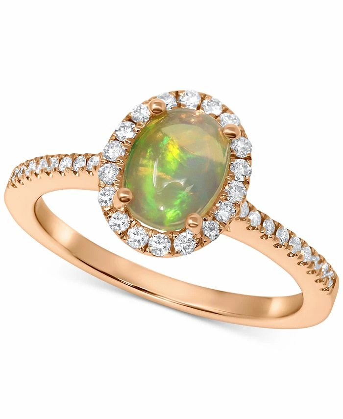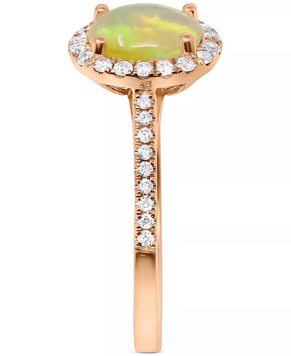 A halo of diamonds frames a beautiful oval-cut opal on this stunning rose gold ring.