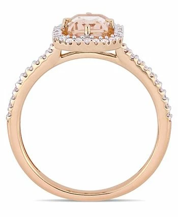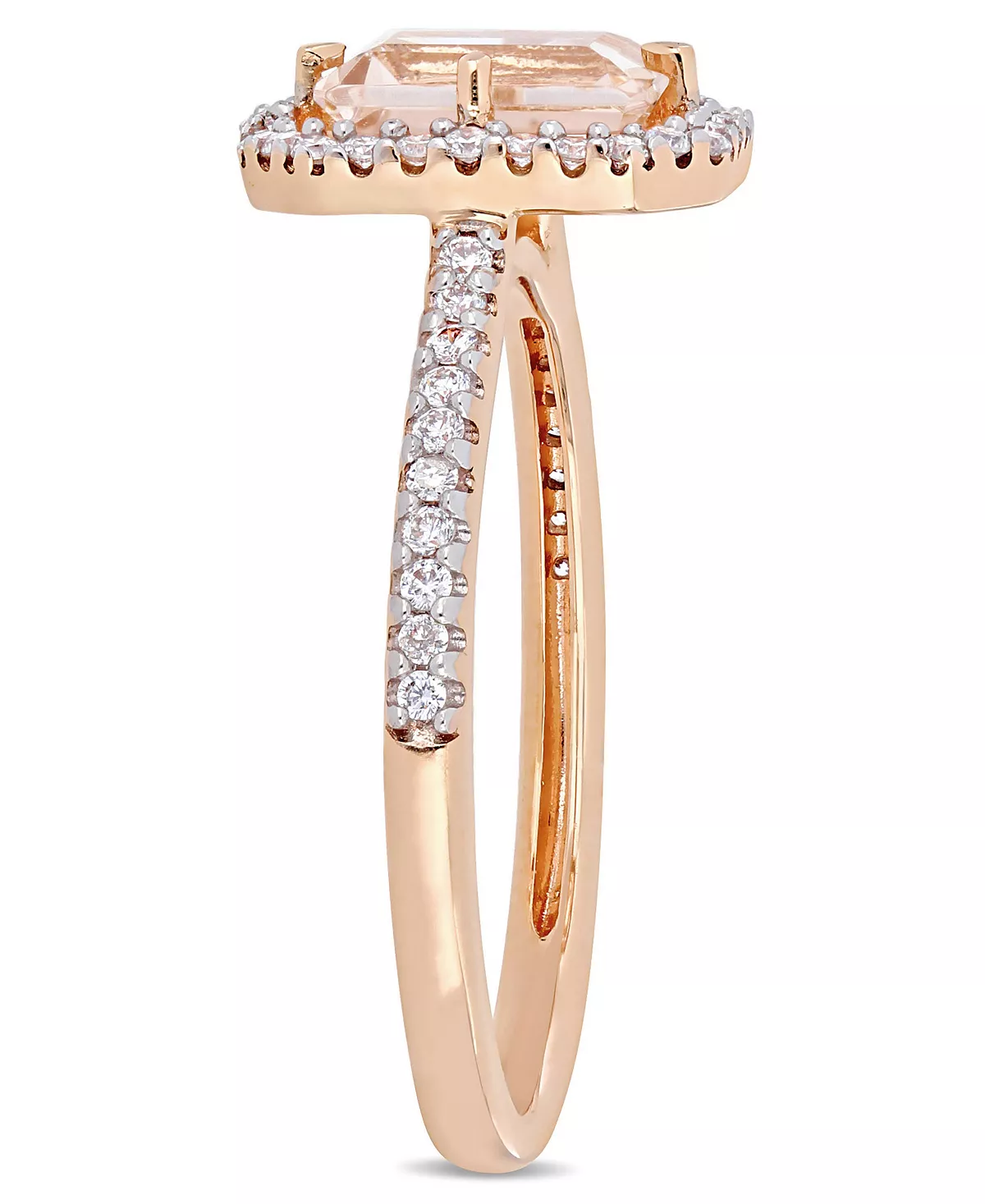 This modern ring is crafted in 14-karat rose gold and features an octagon-cut morganite gemstone with 48 sparkling round diamonds in a unique floating halo design and along the band for added shimmer. This ring is sure to add a touch of elegance and style to any ensemble.