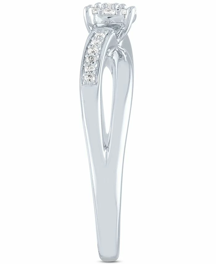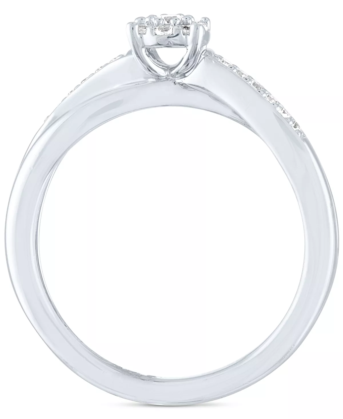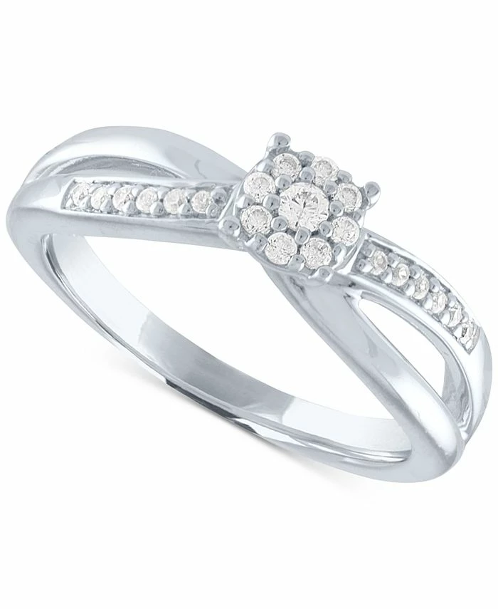 Two delicate twists meet at the lovely diamond cluster that is the highlight of this charming ring in sterling silver.