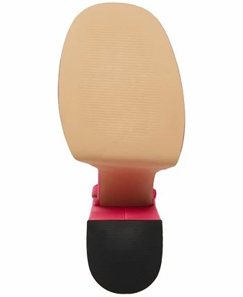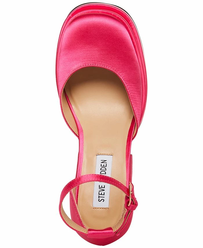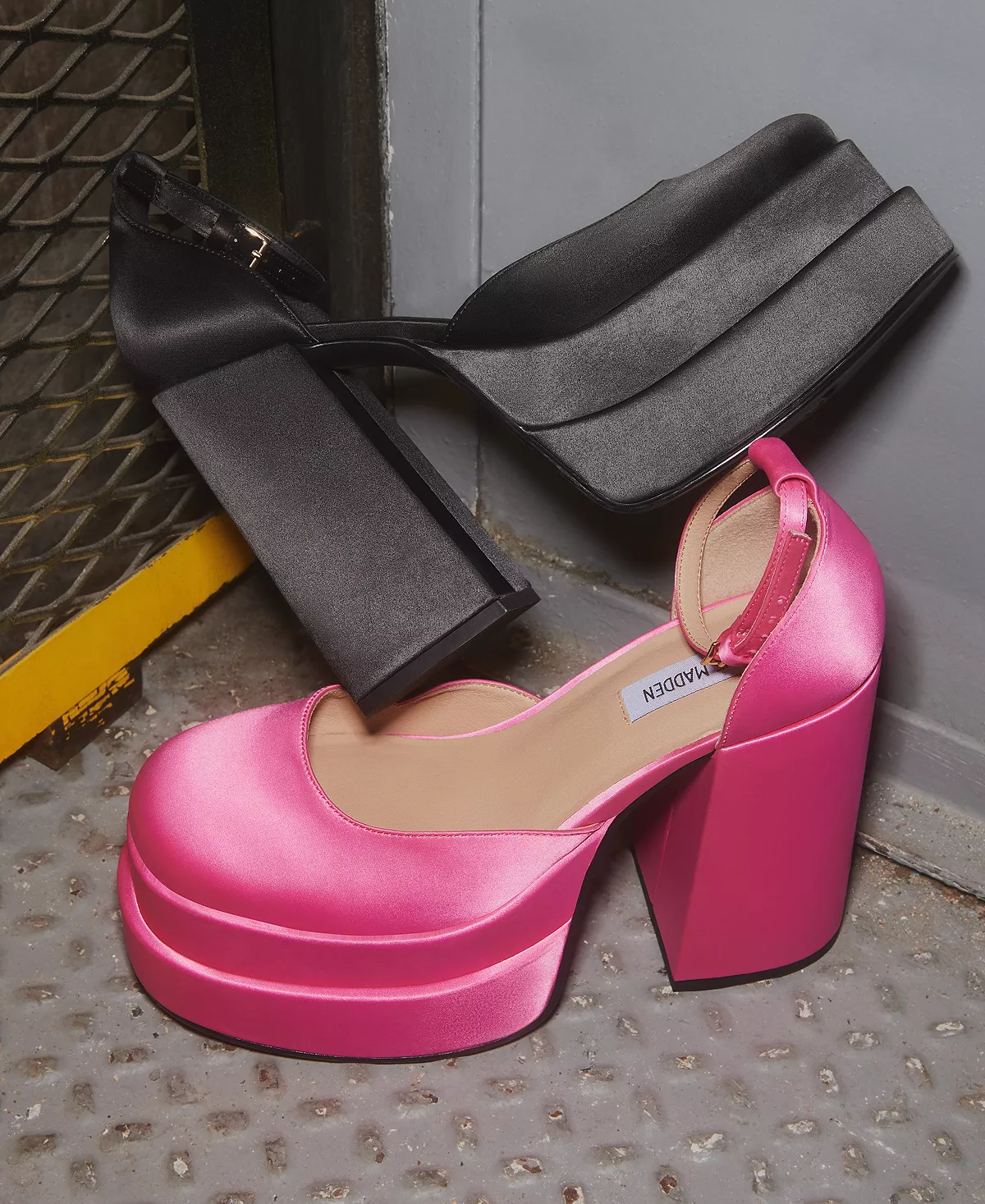 Bold block heels and jumbo platforms make a stylish overstatement in the lustrous satin of Steve Madden’s Charlize ankle-strap pumps.