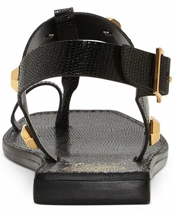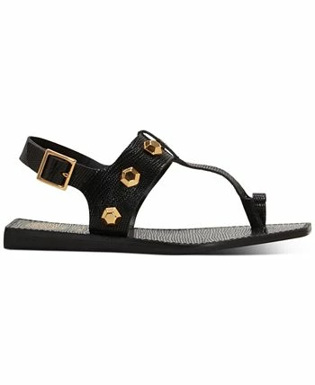 Hexagonal studs and square buckling add polished edge to the Dailette T-strap toe-loop flat sandals from Vince Camuto.