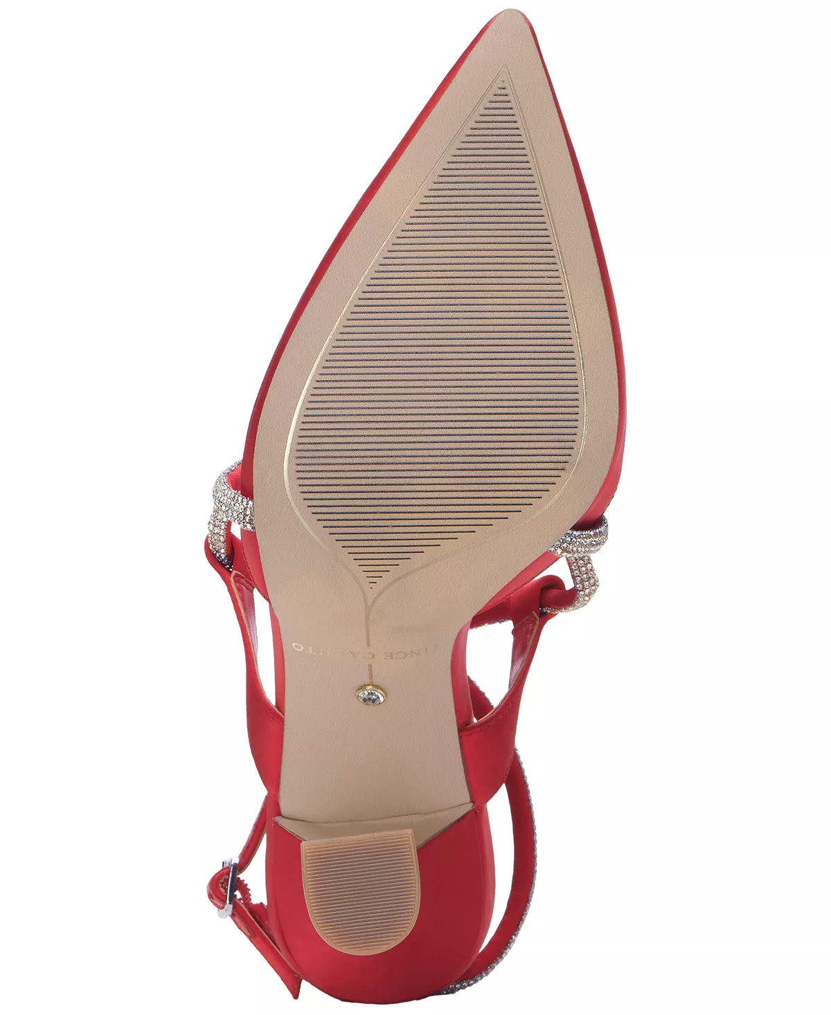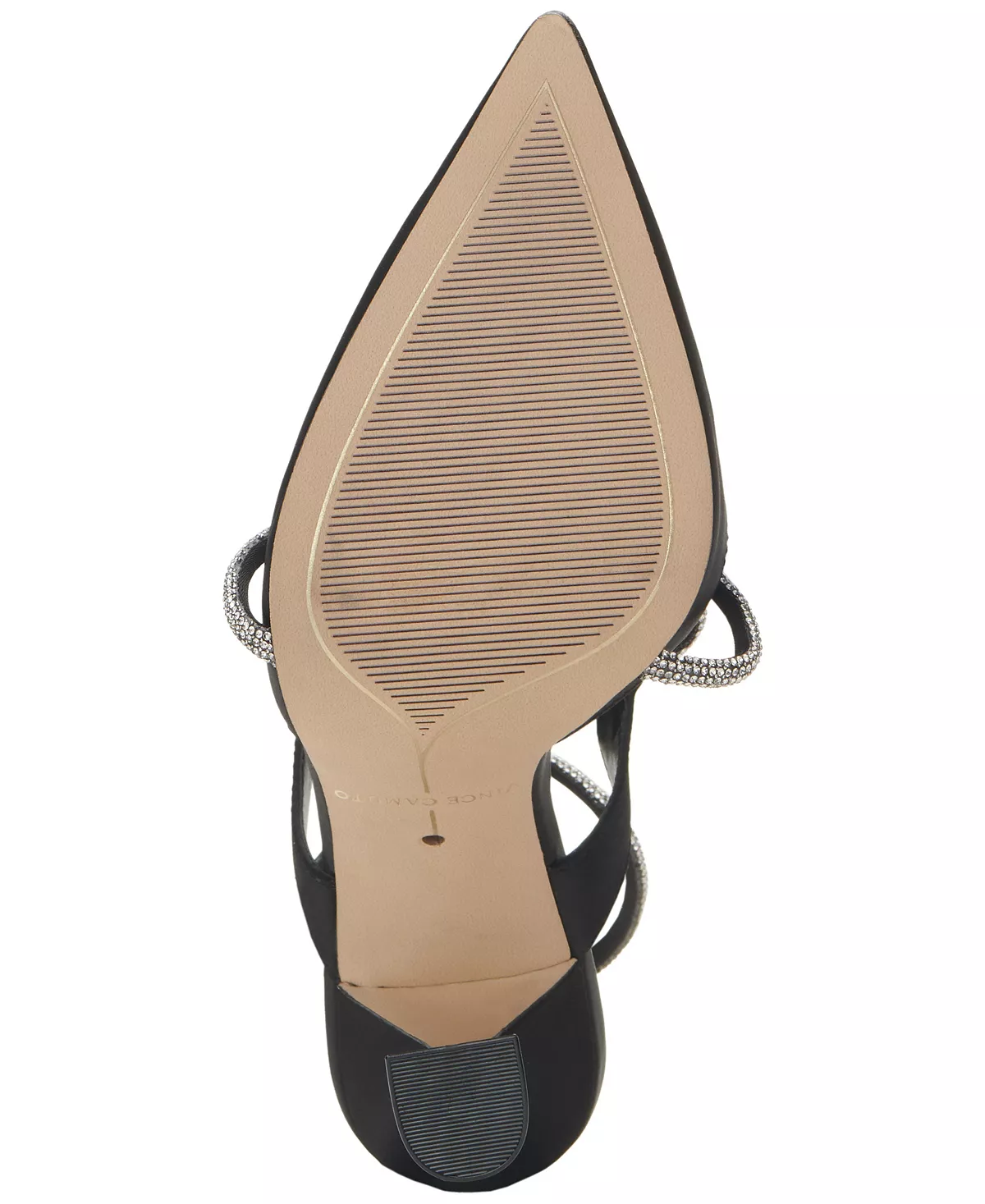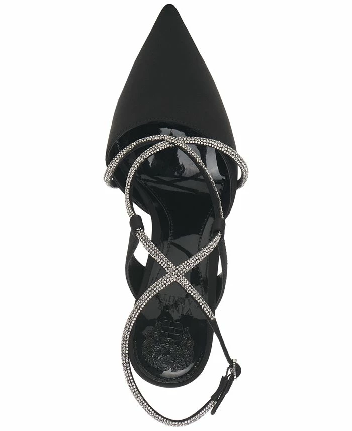 Dazzling double-crisscrossed rhinestone strapping flickers atop the flared-heel design of the Kadrya evening pumps from Vince Camuto.
